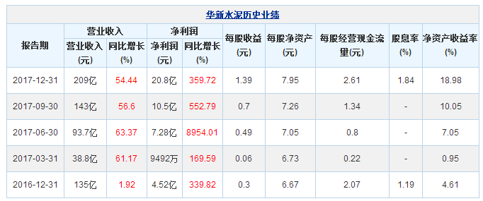 2017年,华新积极贯彻执行国家在供给侧结构性改革、环保督查及错峰生产等方面的政策,着力实施“环保转型、海外发展、电商创新、高新建筑材料拓展”战略,以安全生产为基础,以“三个聚焦”为抓手,以创新发展为方向,加快推进环保、骨料、新材料等新兴业务发展,2017年度公司经营业绩再创历史新高。华新水泥3月26日公布的2017年年报显示,其营业收入209亿元,同比增长54.44%;归属于上市公司股东的净利润20.8亿元,同比增长359.72%。