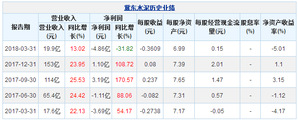 冀东水泥4月20日最新公布的2018年一季报显示,其营业收入19.9亿元,同比增长13.02%;归属于上市公司股东的净利润-4.86亿元,同比下降31.82%。