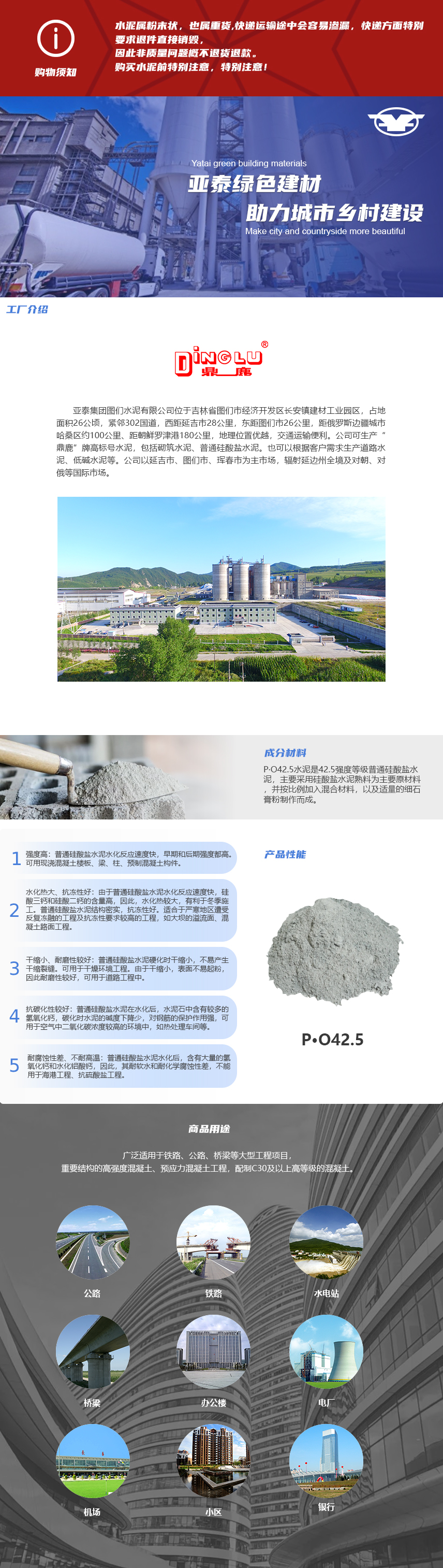 亚泰建材鼎鹿牌水泥-普通硅酸盐水泥(P·O42.5) 袋装散装 工程 道路 桥梁 地铁 隧道 机场 水利沟渠 楼房地基 承重墙 自建房 高档厂房及工厂用水泥