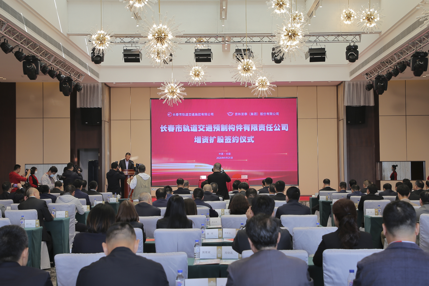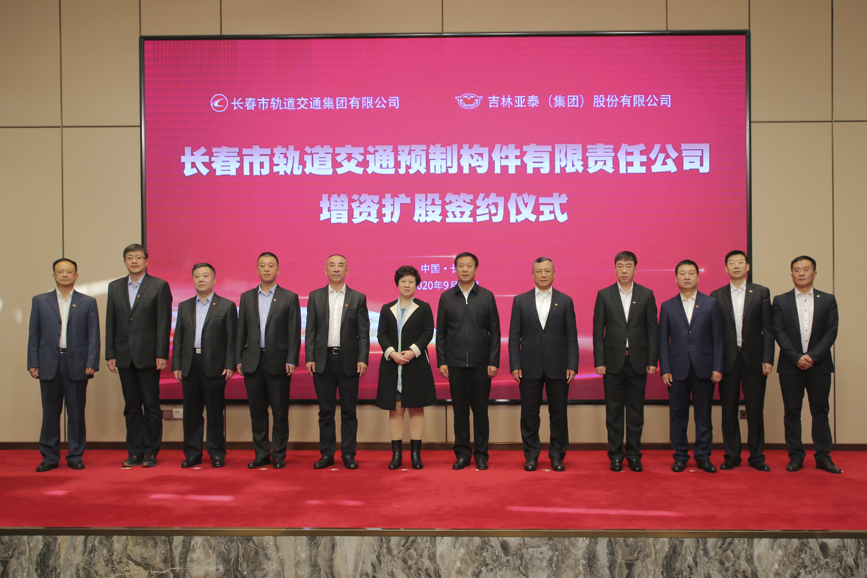 2020年9月25日上午,长春市轨道交通预制构件有限责任公司增资扩股签约仪式在亚泰新城饭店隆重举行。长春市政府副秘书长赵首沣,国资委副主任辛淑兰,长春市轨道交通集团党委书记、董事长曹国利,党委副书记、总经理江涛,副总经理王华安,亚泰集团董事长宋尚龙,副董事长、总裁刘树森,集团副总裁、亚泰建材集团总裁翟怀宇出席了签约仪式。