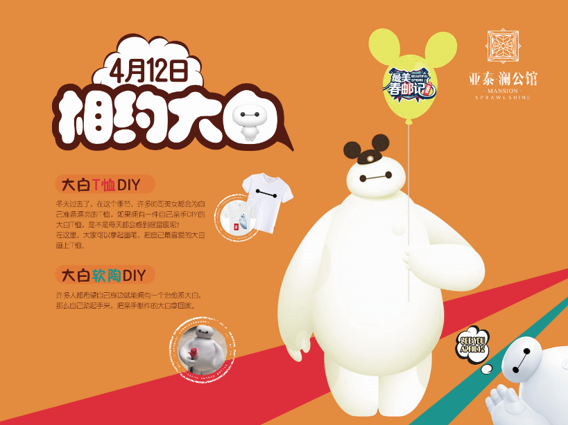 拉斯维加斯的狂欢刚刚落幕,亚泰·澜公馆又有新的精彩上演,本周末亚泰·澜公馆本周末的最美春邮记第四季精彩活动为您精心准备了大白T恤DIY、大白软陶DIY,让你发挥自己的聪明才智,描绘出一个属于自己的大白带回家吧!