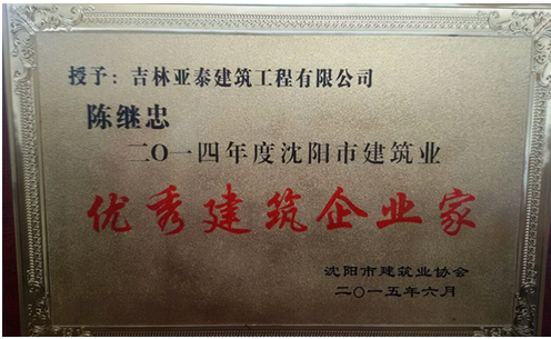法人陈继忠荣获“二零一四年度沈阳市建筑业优秀建筑企业家”奖项。