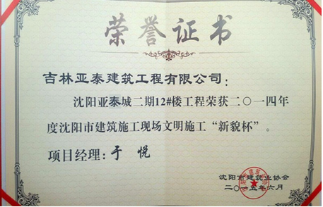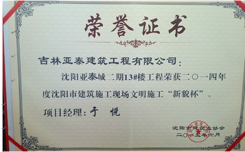 本次获奖是我公司在沈阳建筑业取得施工质量管理与安全文明施工管理的又一次殊荣,也是沈阳市建筑业对我公司的施工项目质量及安全文明施工管理的认可。2016年,吉林亚泰建筑工程有限公司承建沈阳亚泰城三期项目,将继续严抓工程质量管理及安全文明施工管理,创建亚泰品牌精品工程,继续争创“新貌杯”等奖项。