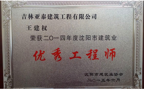 沈阳亚泰城项目二期12#、13#工程师王建权荣获“优秀工程师”奖项。