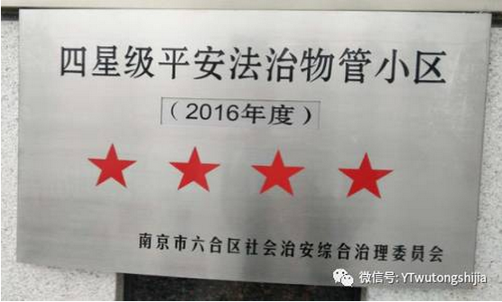 2017年4月28日,亚泰梧桐世家小区荣获南京市六合区政府颁发的“四星级平安法治物管小区”荣誉称号,南京市六合区仅有四个小区获此殊荣。2016年9月亚泰物业南京公司接待了六合区住建委、物业办公室等相关政府部门领导一行约200人到小区参观,并经过多轮专家评审脱颖而出。