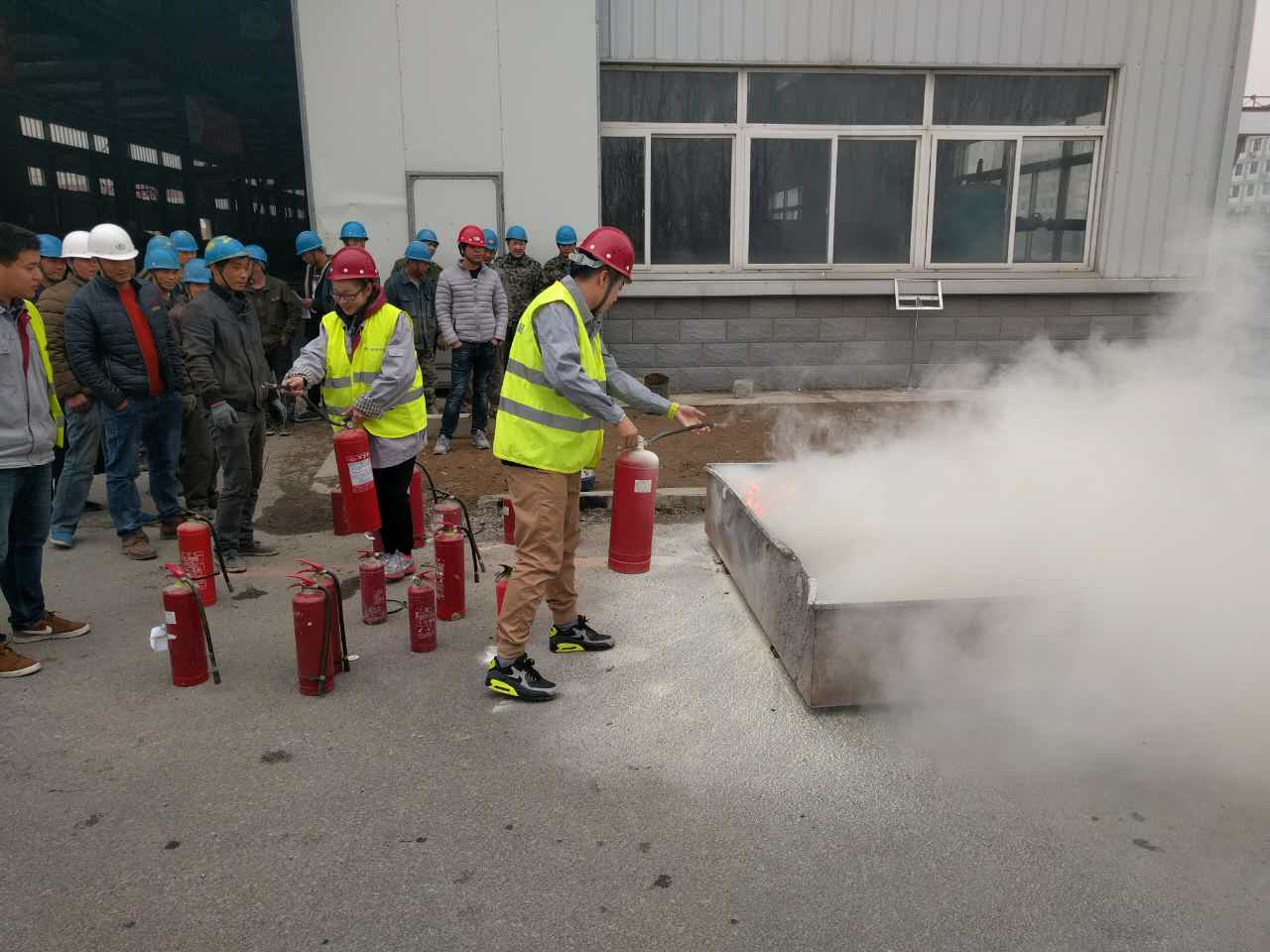 在认真听讲及观摩后,各位职员亲自体验了现场灭火的过程,面对熊熊燃烧的火堆,各位同事表现的十分沉着,熟练地按照灭火的步骤和方法,将燃起的浓烟大火成功的迅速扑灭,做到了冷静沉着的面对突发现象,成功快速的扑灭大火的消防标准。
