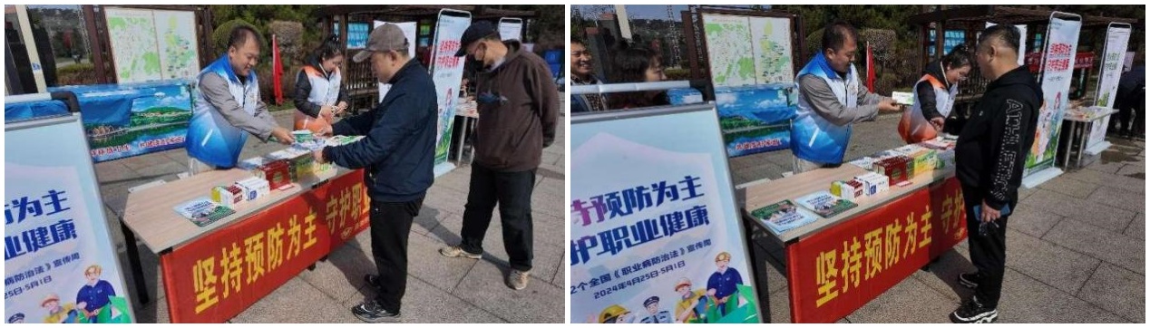 在职业病法治宣传过程中,企业打出“坚持预防为主,守护职业健康”宣传口号,设立宣传展板,发放宣传材料,向来往群众介绍了什么是职业病,其危害有哪些,以及如何预防、救治方法、职业病防治法保护条款等相关知识。