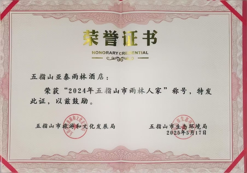 荣获由五指山市旅游和文化发展局与五指山市生态环境局联合颁发的 “2024年五指山市雨林人家” 称号!