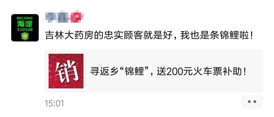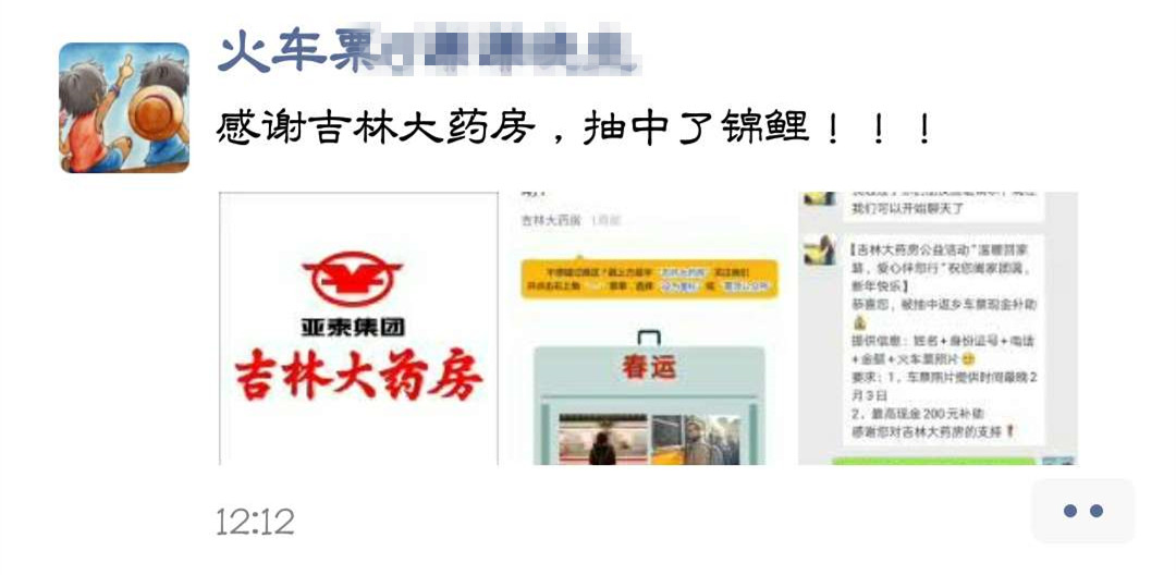 春运,是我国每年一次的人口大迁移,是回乡情节的最深情的流露,总有一部分人或因节俭、或因繁忙等原因,不能回家过年。作为一名异地打工的外地人,都十分渴望能够买上一张火车票回到家乡,吉林大药房与白云山和黄中药一同帮助他们圆自己回家与父母、家人团聚的团圆梦。活动中受惠的务工人第一时间发布朋友圈,表示欣喜和感谢!
