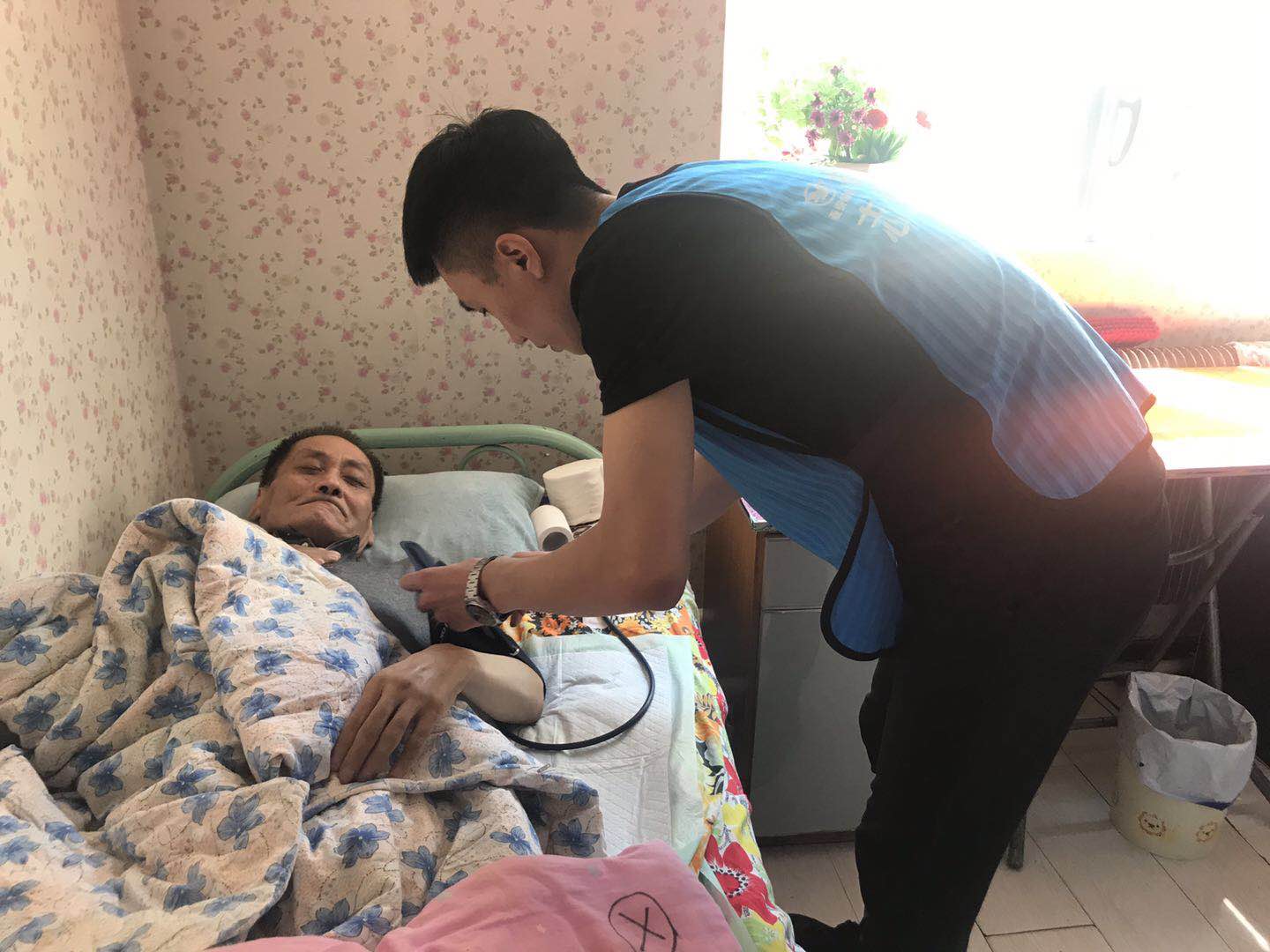 上图:后备店长为老人们测量血压、讲解用药及饮食注意事项