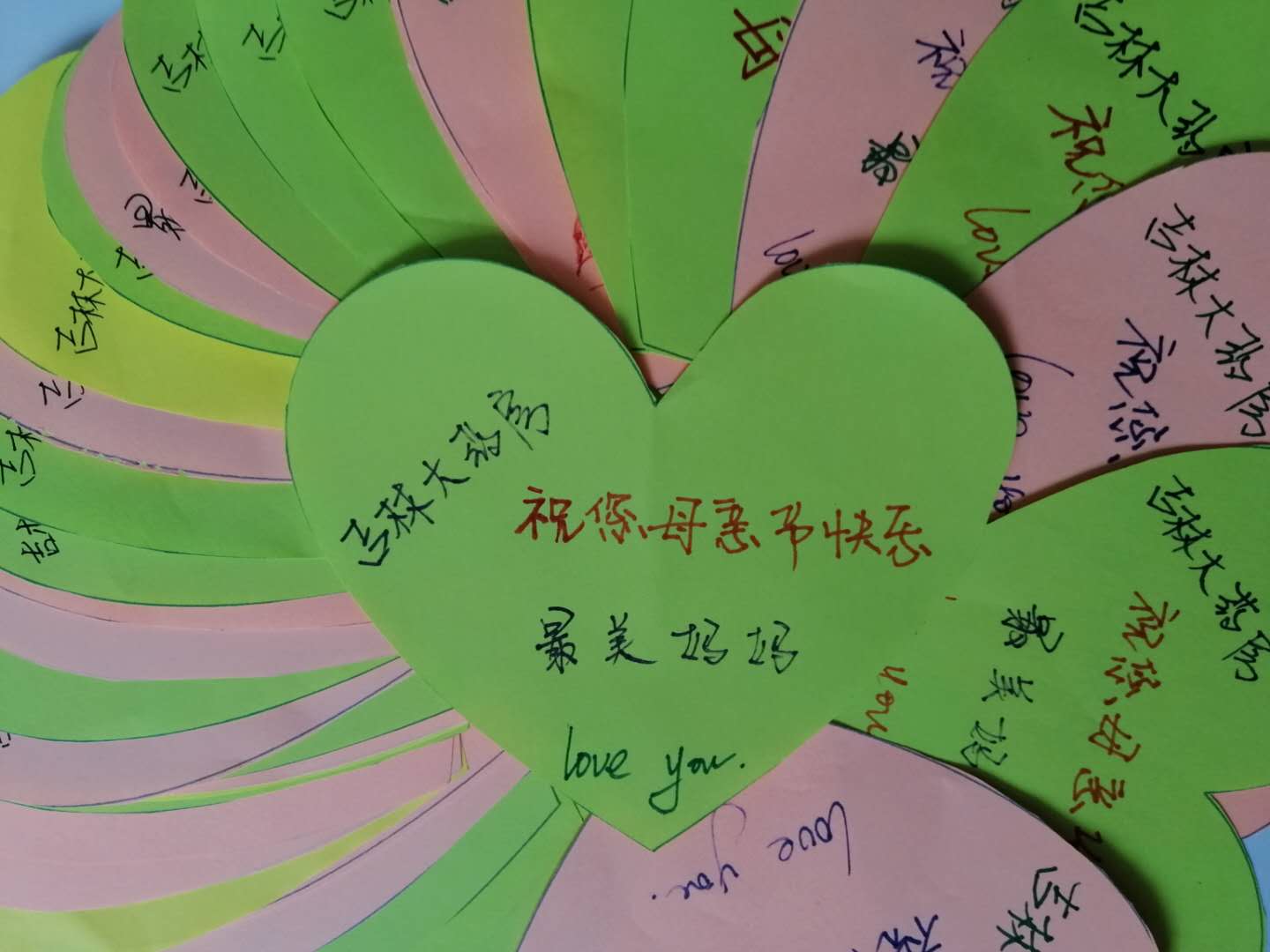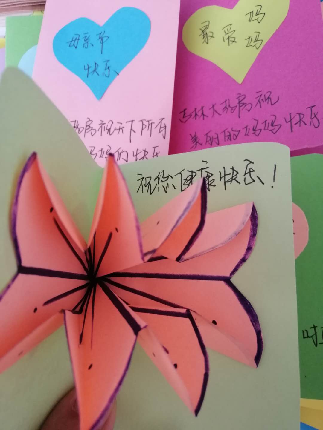 志愿者还为小朋友们精心准备了空白爱心贺卡,指导他们写下对妈妈的祝福,看见孩子稚嫩的笔迹写出“妈妈我爱你”,每个志愿者心中都油然而生一种感动和温暖。