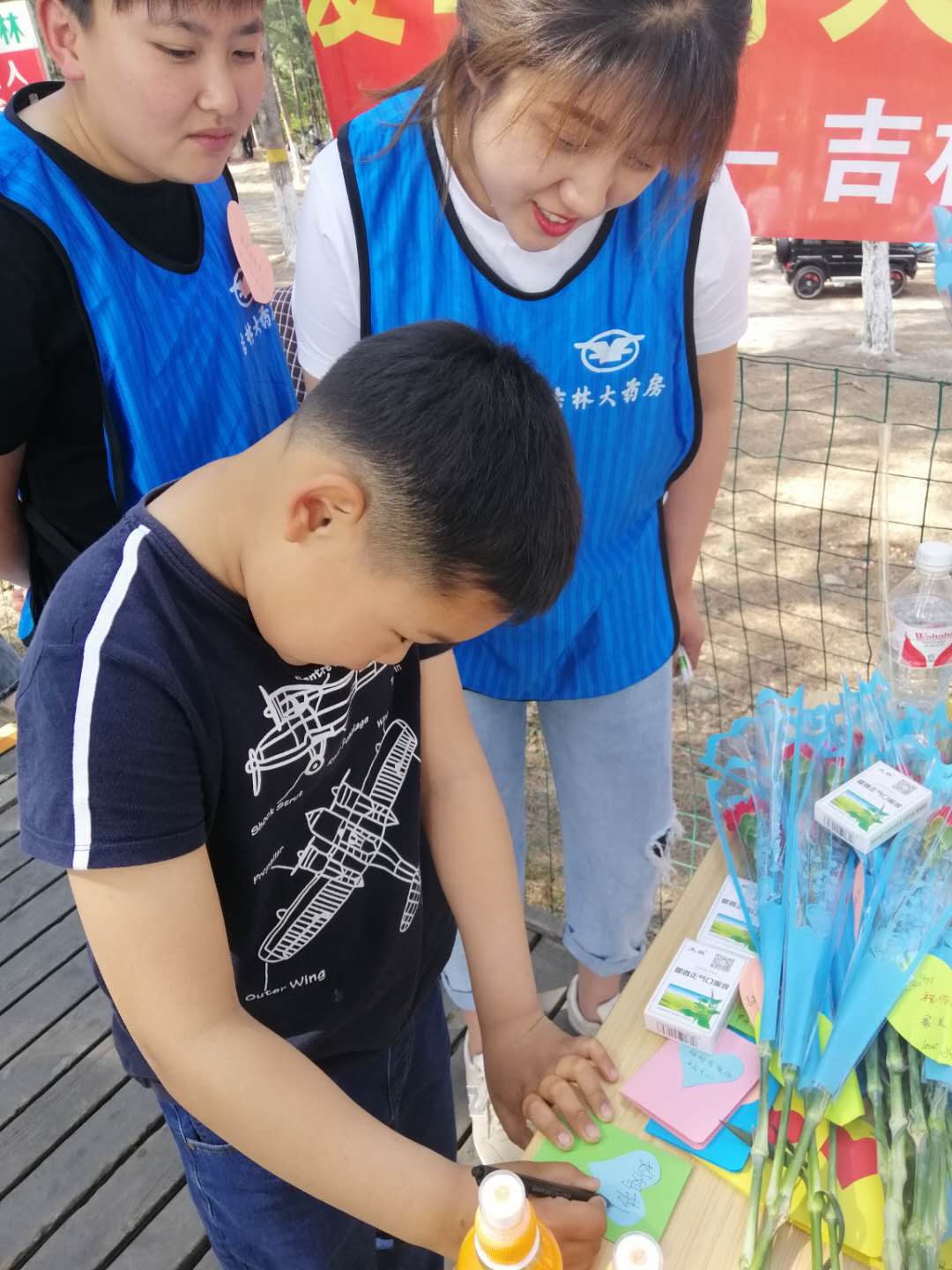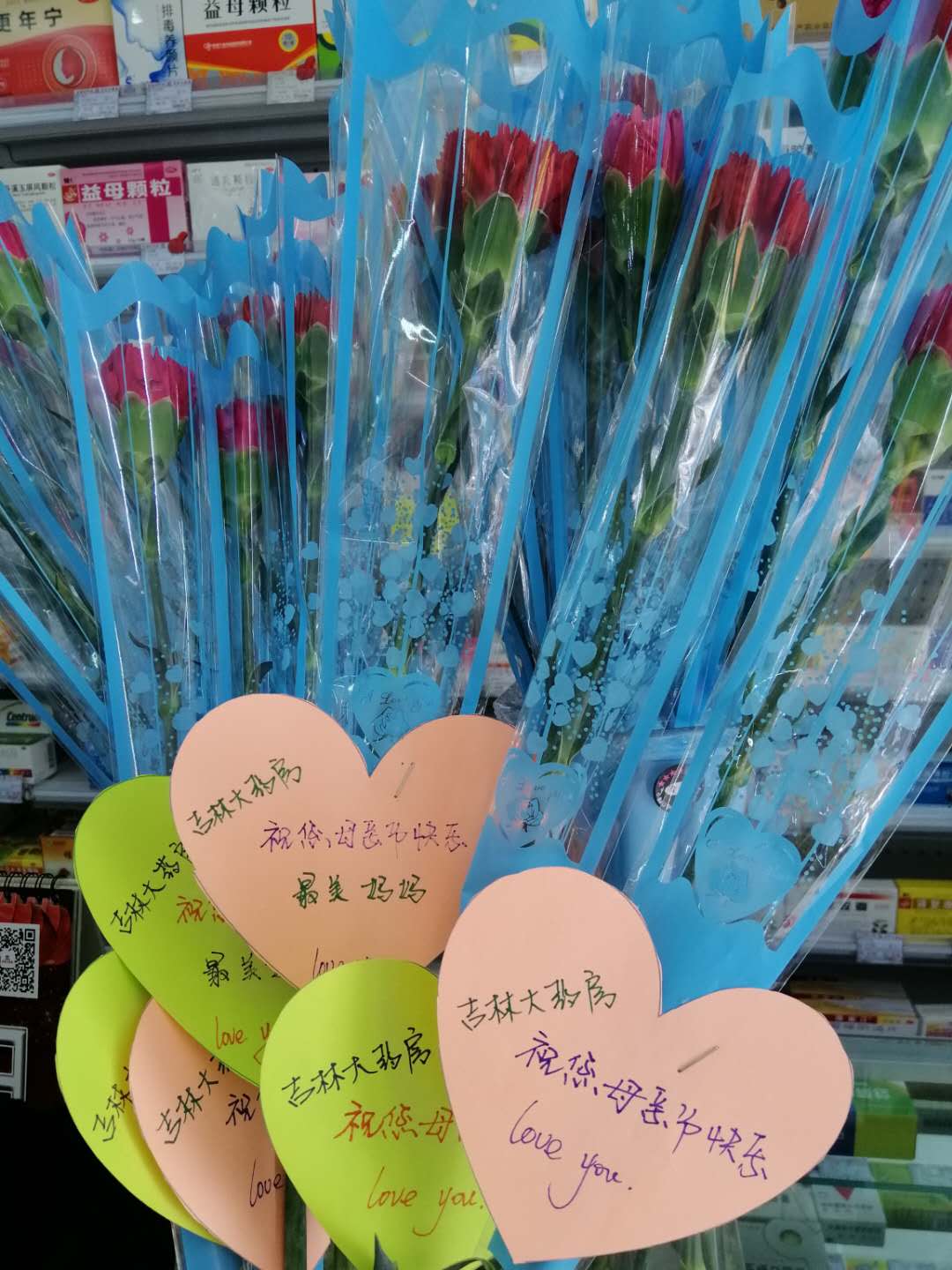 吉林大药房志愿者们通过象征魅力和尊敬的康乃馨及爱心贺卡传递爱、宣传爱,同时引导群众大胆的表达爱、抒发爱。他们用亲手制作的精美卡片写下对天下母亲的问候与祝愿:祝您身体健康、愿您永远年轻、妈妈您辛苦了、您是我心中最漂亮的女人等话语。