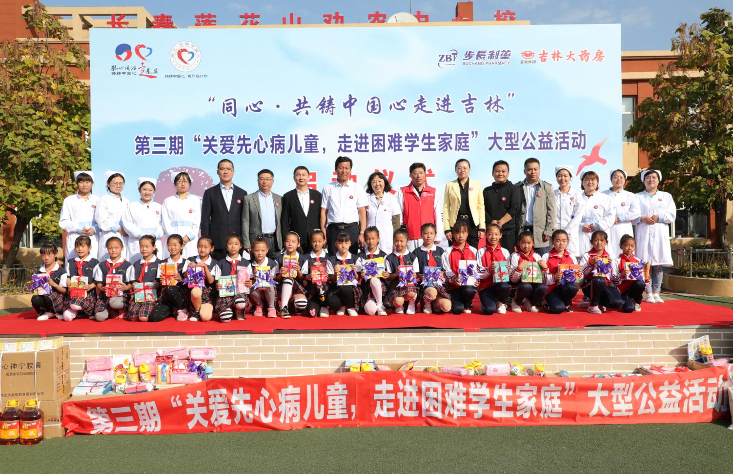 亭皋木叶下,万里秋云飞。9月26日,亚泰医药集团吉林大药房携手步长制药开展的“同心共铸中国心走进吉林”第三期“关爱先心病儿童,走进困难学生家庭”大型公益活动在长春市莲花山劝农镇中心学校正式启动。吉林省中西医结合学会秘书长张晓慧女士、长春市莲花山旅游度假区教育局副局长孙刚先生及双方企业多位领导亲临活动现场。