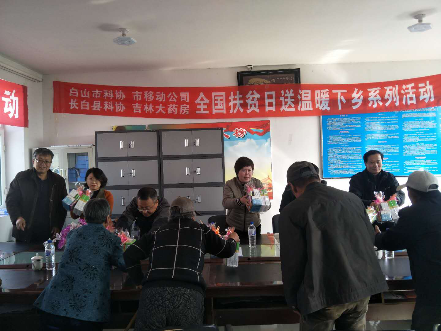 上图:白山区区经理刘青女士和科协办领导为贫困居民发放常用药品