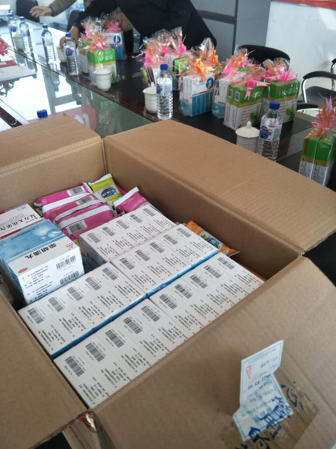 上图:捐赠二丁颗粒50盒、柴胡滴丸100盒、果维康维生素C一箱、复方无花果含片60盒