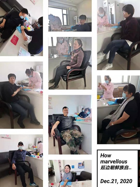 2020年12月18日,亚泰龙鑫药业组织志愿者开展献血活动。本次无偿献血的地点在和龙市文化社区医院。清晨八点钟许,亚泰龙鑫药业的九名志愿者齐聚社区医院四楼。先后进行了登记,测量身高体重,量血压,采血化验的流程,经检验九名志愿者的指标均合格。最后大家每人均献血300毫升,共计2700毫升。