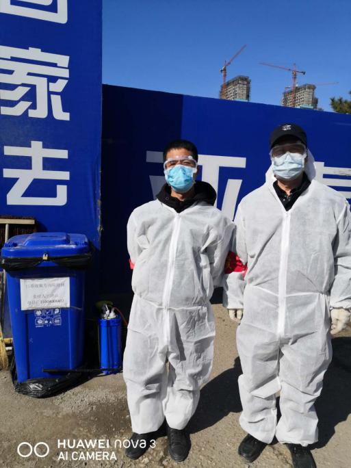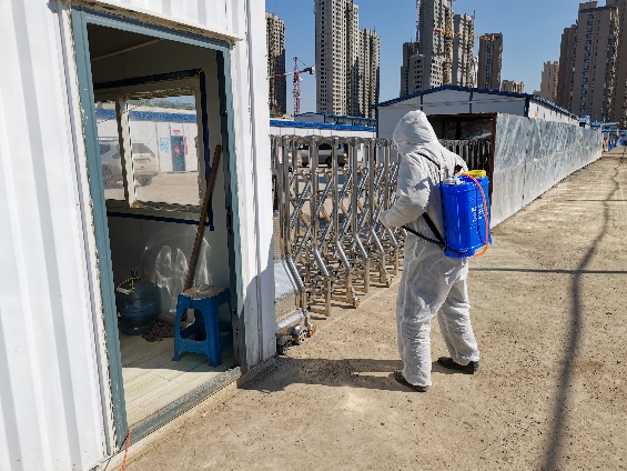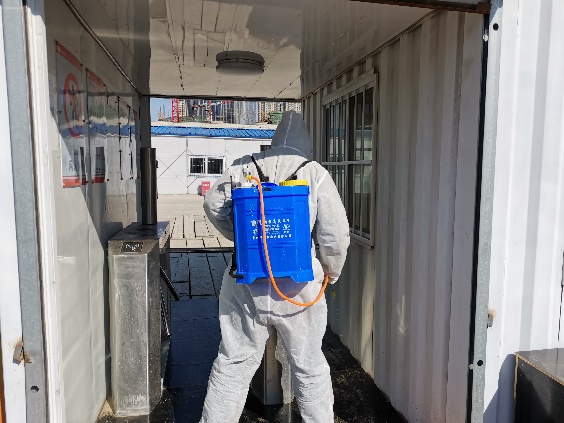 项目管理人员按照公司要求组织专人负责每日三次的全区消杀工作,消杀人员佩戴防疫服饰和装备,对生活区和办公区进行全方位的消杀作业。