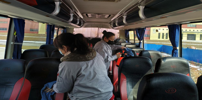 车间女员工全面消毒九台班车,确保全体员工安全上下班。