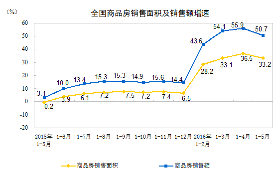 1-5 月份,商品房销售面积 47954 万平方米,同比增长 33.2% ,增速比 1-4 月份回落 3.3 个百分点。其中,住宅销售面积增长 34.2% ,办公楼销售面积增长 44.0% ,商业营业用房销售面积增长 18.1% 。商品房销售额 36775 亿元,增长 50.7% ,增速回落 5.2 个百分点。其中,住宅销售额增长 53.4% ,办公楼销售额增长 72.8% ,商业营业用房销售额增长 21.2% 。