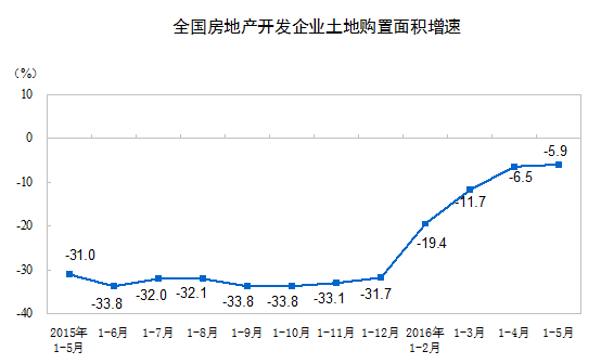 1-5 月份,房地产开发企业土地购置面积 7196 万平方米,同比下降 5.9% ,降幅比 1-4 月份收窄 0.6 个百分点;土地成交价款 2295 亿元,增长 4.7% , 1-4 月份为下降 0.2% 。
