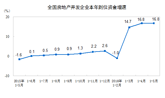 1-5 月份,房地产开发企业到位资金 53681 亿元,同比增长 16.8% ,增速与 1-4 月份持平。其中,国内贷款 8945 亿元,增长 2.3% ;利用外资 42 亿元,下降 72.1% ;自筹资金 18643 亿元,增长 1.4% ;其他资金 26051 亿元,增长 39.4% 。在其他资金中,定金及预收款 14840 亿元,增长 35.2% ;个人按揭贷款 8838 亿元,增长 58.5% 。