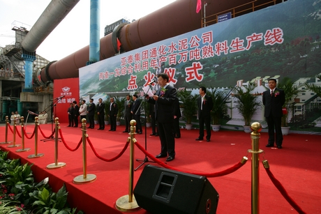 9月27日上午,亚泰集团通化水泥有限公司“两渣一灰”综合利用年产百万吨熟料生产线点火仪式在通化市五道江举行。省委常委、常务副省长竺延风、省发改委副主任秦福义、省工信厅巡视员孟励、通化市委书记张安顺、市委常委、市委秘书长管维新、市人大副主任田锡军、市政府副市长赵忠国、市政协副主席张吉贵等通化市、二道江相关部门的主要领导;集团公司董事长、总裁宋尚龙、集团公司副总裁徐德复、纪委书记、工会主席张宝谦、党委副书记、副总裁张凤瑛、总裁助理翟怀宇及企业、总部相关部门负责人、省市相关新闻媒体记者等三百余人参加了点火仪式。