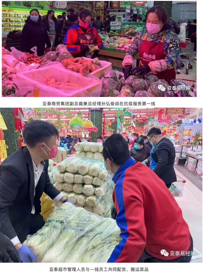 疫情来袭,生鲜果蔬成为销售热点,商品需求大、客流集中。亚泰超市全体后勤人员在保质保量完成本职工作外,全体人员齐上阵,全部支援到各门店生鲜卖场,帮助门店打包、上货、称重。为了让商品快速运转起来,节省顾客停留等待时间,减少交叉感染几率,亚泰超市还创新营销方式,将顾客商品采购时间缩短至5分钟以内。
