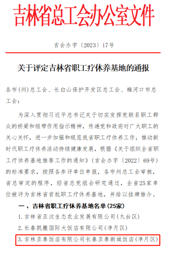 热烈祝贺亚泰新城饭店入选吉林省首批职工疗休养基地名单!亚泰新城饭店将更加精细服务,为吉林省职工的幸福感、获得感进一步提升,为职工疗休养工作持续发展贡献力量!