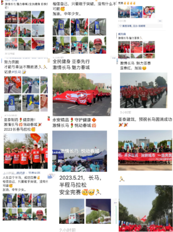 亚泰集团2023长马组委会制定了细致的宣传组织方案,成立了摄影等多个工作群、赛事组,在赛前、赛中和赛后,在每一时间和节点,都做了周密的安排和发动。大家集照片、谈感想、发抖音、朋友圈,亚泰医药、亚泰地产等产业集团、企业高管带头,第一时间在网上发布短视频,收获了频频点赞和转发,“亚泰红”刷屏满眼,正能量满满,线下线上汇成了亚泰人的欢乐海洋。中央电视台体育频道等多家新闻媒体也现场直播了亚泰人的参赛盛况。