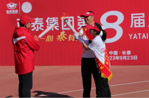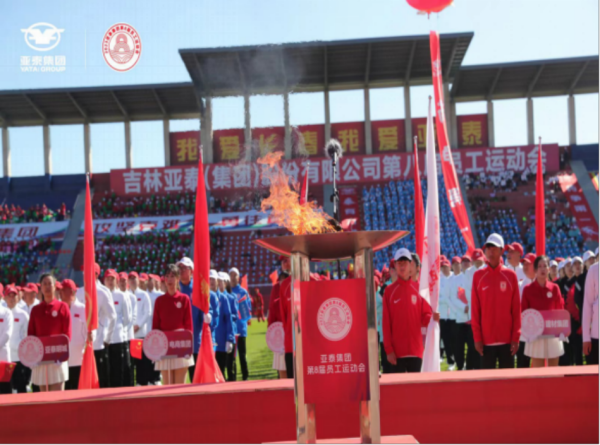 上午8时整,68支代表队5000名员工代表2万多名员工接受检阅,步履铿锵彰显亚泰人“坚持积极不懈怠,自强不息创未来”的精神风貌;礼炮响彻云霄,气球扶摇直上,宣告运动会在继往开来中盛大启幕,寓意亚泰事业在开启“二次高创”中蓬勃发展。《全员健身 亚泰先行》专题片呈现在大屏幕,带领大家共同追溯亚泰集团发展历程的波澜壮阔,展现亚泰集团的“跑步文化”和弘扬马拉松精神,一往无前、逐梦远方的豪迈。火炬手从位于吉林大路的亚泰大厦出发,由集团高管、产业和企业员工代表持火炬穿越吉林大路、亚泰大街、生态大街、天泽大路,接力21公里,传递象征着“团结、诚信、高效、开拓”的火炬,跑进亚泰体育文化中心主会场,宋尚龙董事长接过火炬走向点火台并点燃主火炬,将亚泰精神之火,汇聚2万余员工心中的熊熊火炬,照亮“打造百年亚泰基业”的追梦征程。火炬传递过程,也展现了亚泰集团广大员工崇尚劳动、专于技艺、匠心传承、将小家与大家相连,共同奔赴美好未来的动人画面。
