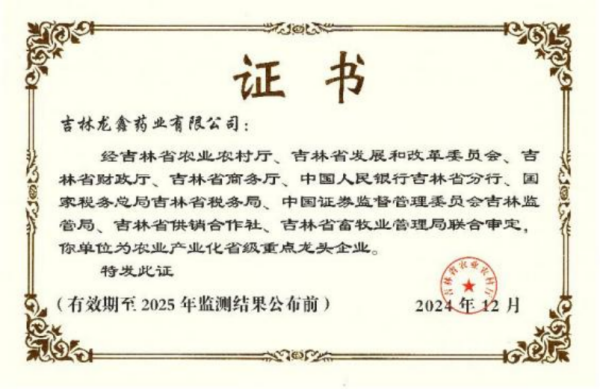 近日 ,吉林省农业农村厅发布了《关于公布监测合格和延迟监测农业产业化省级重点龙头企业名单与2024年新认定农业产业化省级重点龙头企业名单的通知》,对全省农业产业化省级重点龙头企业进行了新一轮的认定与调整。亚泰龙鑫药业在此次评定中表现出色,成功通过监测,延续荣获“农业产业化省级重点龙头企业”称号 。