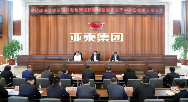 陈铁志同志首先介绍了5月20日吉林省委副书记、省长胡玉亭到集团进行的长达三个半小时的专题调研情况,包括参加调研的人员和行程。陪同调研的有省政府秘书长刘伟、省政府办公厅副主任秦政,还有中省直有关部门,吉林证监局局长李立国、省工信厅厅长宋刚、省财政厅厅长陈宇龙、省住建厅厅长徐亮、省国资委主任吕鑫、省体育局局长牟大鹏、省地方金融监管局局长张兆义、省药监局局长孙继民,长春市委副书记、市长王子联,市委常委、常务副市长吴波,市政府秘书长张海治、市财政局局长梁冰、市国资委主任孙立彬等同志。集团公司参加调研活动的有党委书记、董事长陈铁志,副董事长、总裁刘树森,党委副书记、副总裁李斌,副总裁秦音,地产集团董事长、总裁韩冬阳,医药集团董事长、总裁冯伟杰,建材集团常务副总裁陈波等。省市各级政府领导现场决策,给予亚泰集团“超常规”的帮扶政策和“真金白银”的项目支持。
