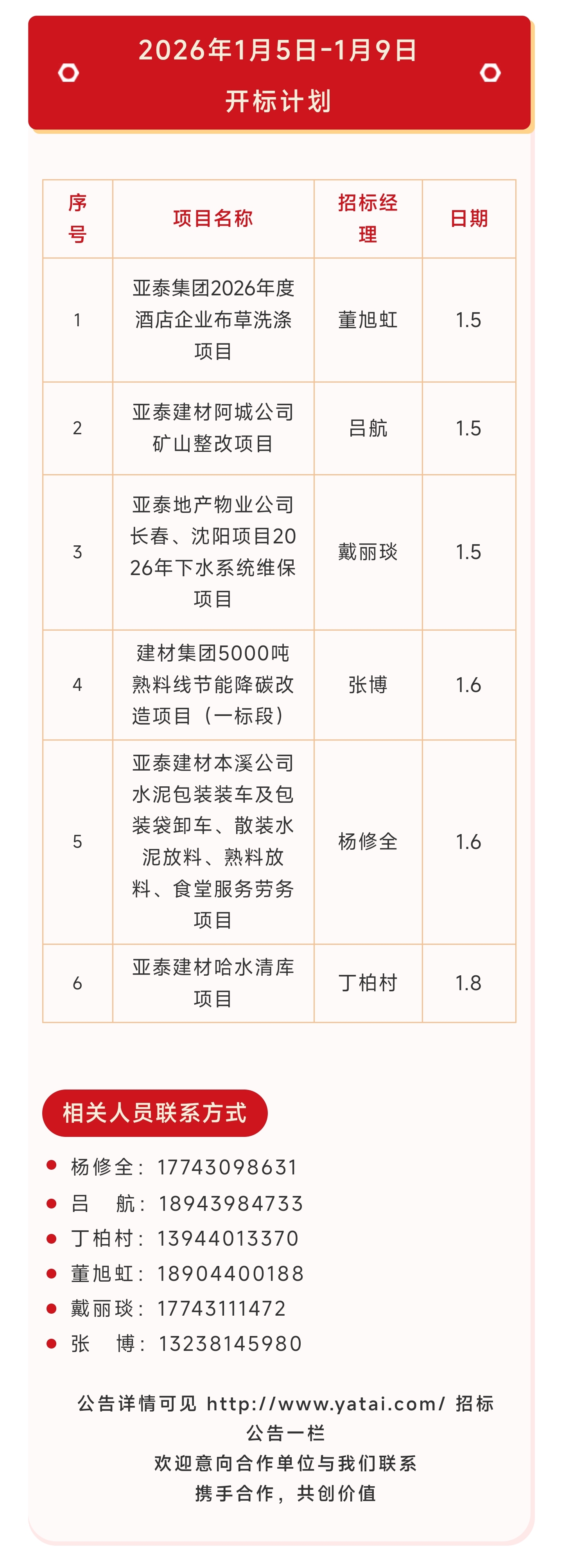 亚泰集团2026年1月5日-2026年1月9日开标计划