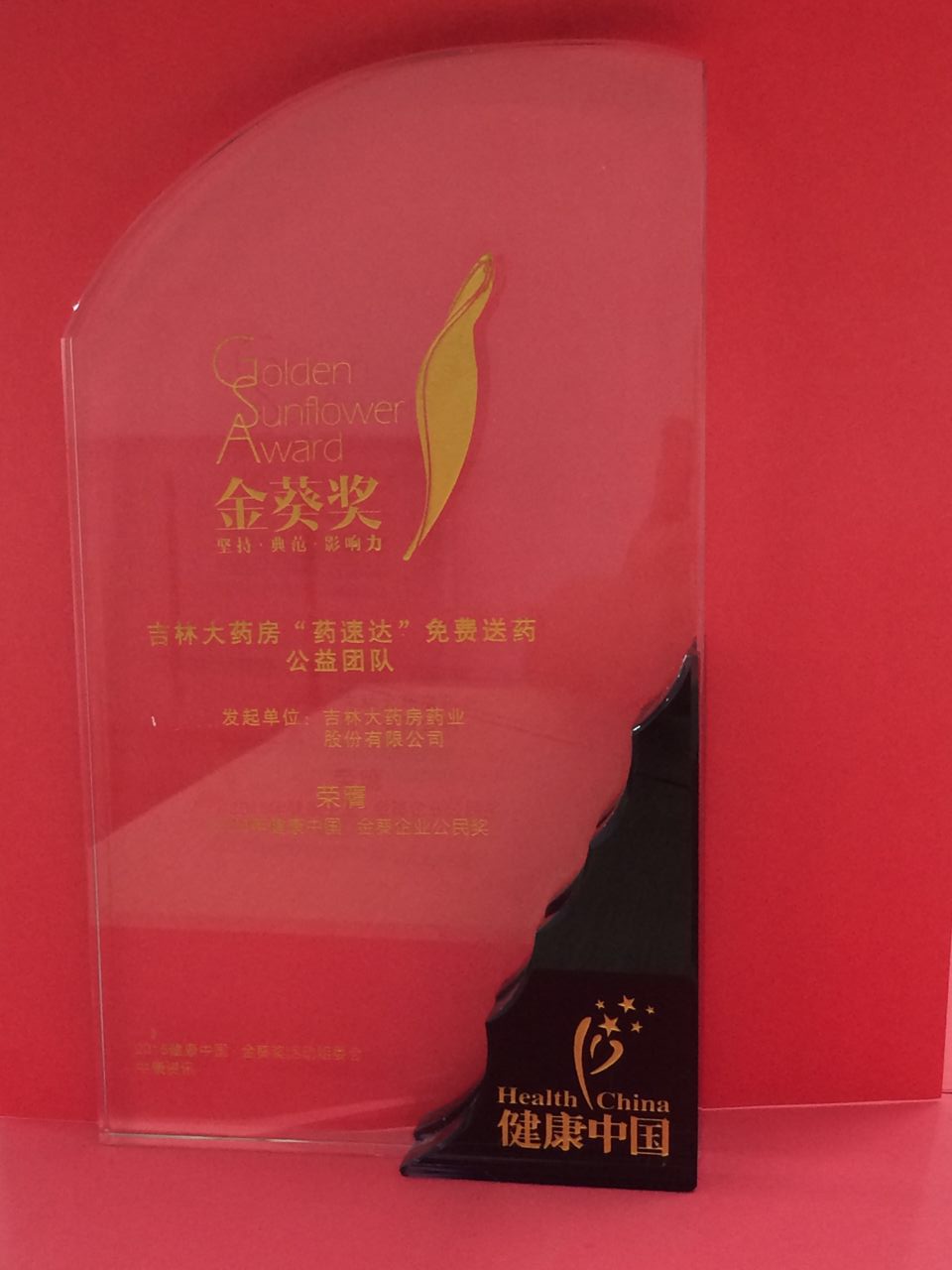 吉林大药房一直秉承“您的健康我们的责任危急时刻让爱先行”的服务宗旨,全面开展“药速达”公益团队24小时免费送药上门、关爱弱势群体等多项公益活动,并将企业自身的形象、品牌价值注入公益活动中。经过激烈的网上投票和评审组评选,最终获得“2015年健康中国.金葵企业公民奖”称号。
