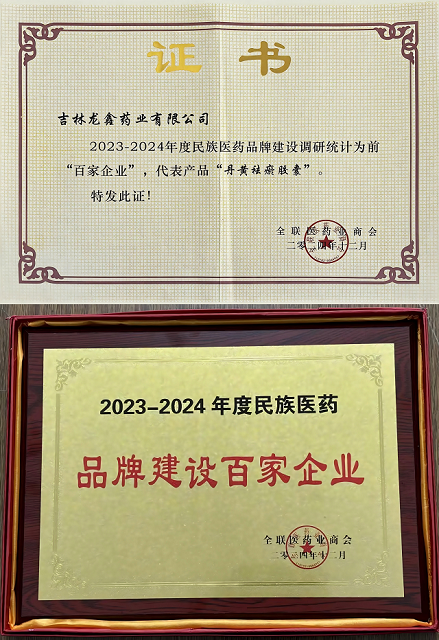 2024年12月,亚泰龙鑫药业荣获“2023-2024年度民族医药品牌建设百家企业”荣誉称号,企业代表产品“丹黄祛瘀胶囊”。