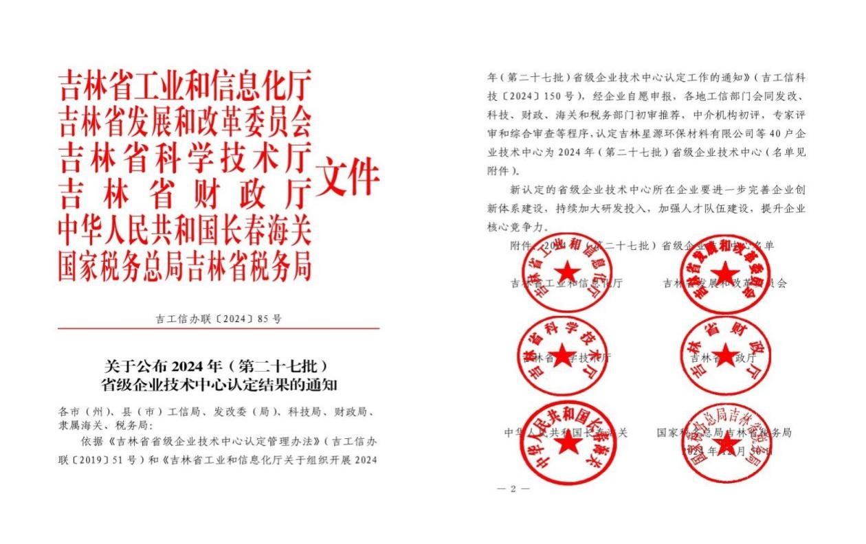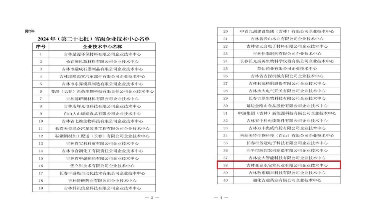 吉林省工信和信息化厅认定吉林亚泰永安堂药业有限公司技术中心为 2024 年省级企业技术中心。