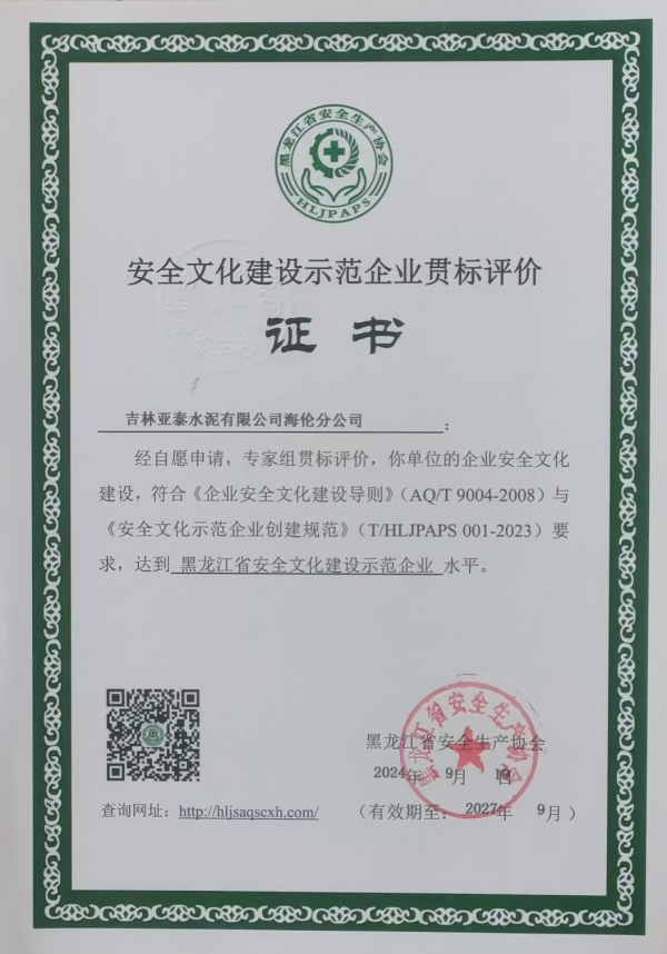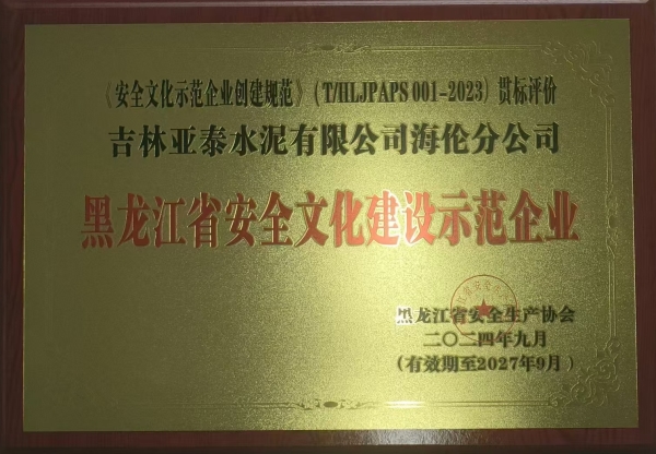 吉林亚泰水泥有限公司海伦分公司(以下简称亚泰建材海伦公司)凭借其在安全文化建设方面的卓越表现,荣获了黑龙江省安全协会颁发的《黑龙江省安全文化建设示范企业》的荣誉评价,这一荣誉不仅是对亚泰建材海伦公司长期以来重视安全工作的高度肯定,更是其在安全文化建设道路上的一座重要里程碑。