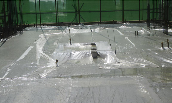 混凝土施工完毕后覆盖薄膜塑料布,定期浇水养护,保证砼强度,养护时间14天