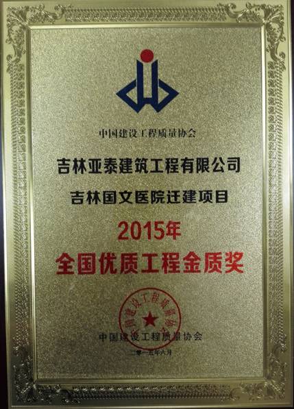2015年6月5日中国建设工程质量协会在北京钓鱼台国宾馆召开2015年度全国房地产业、建筑业高层论坛及2015年度全国优质工程评选工作会议。由吉林亚泰建筑工程有限公司施工的“吉林国文医院迁建项目”获得《2015全国优质工程金质奖》称号。