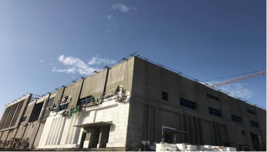 45、10月份, 现场屋面(含两侧裙房)防水完成,外立面装饰龙骨安装完成,外墙保温施工完成。