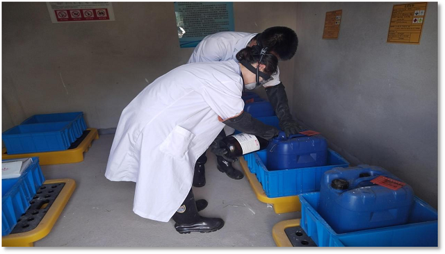 上图:亚泰龙鑫药业企业员工正在进行危险废物事故应急演练
