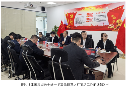 为进一步弘扬勤俭节约优良作风,会议传达了《亚泰集团关于进一步加强日常厉行节约工作的通知》,要求全体员工提高思想认识,牢固树立“节约光荣、浪费可耻”的理念,从节约一度电、一张纸、一滴水做起,将厉行节约要求融入办公、生产、运营各环节,杜绝各类浪费行为,营造勤俭节约、艰苦奋斗的良好氛围,切实降低企业运营成本,提升资源利用效率。
