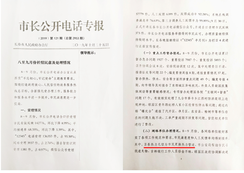 10月25日,《市长公开电话专报【2019】第121期(总第2953期)》对亚泰热力无偿为市民更换管道事迹进行了刊登,不仅对亚泰热力的工作给予了肯定和支持,更加鼓励企业要继续提升市民满意度,将服务放在第一位,为百姓提供“利民、便民、惠民”的优质服务。