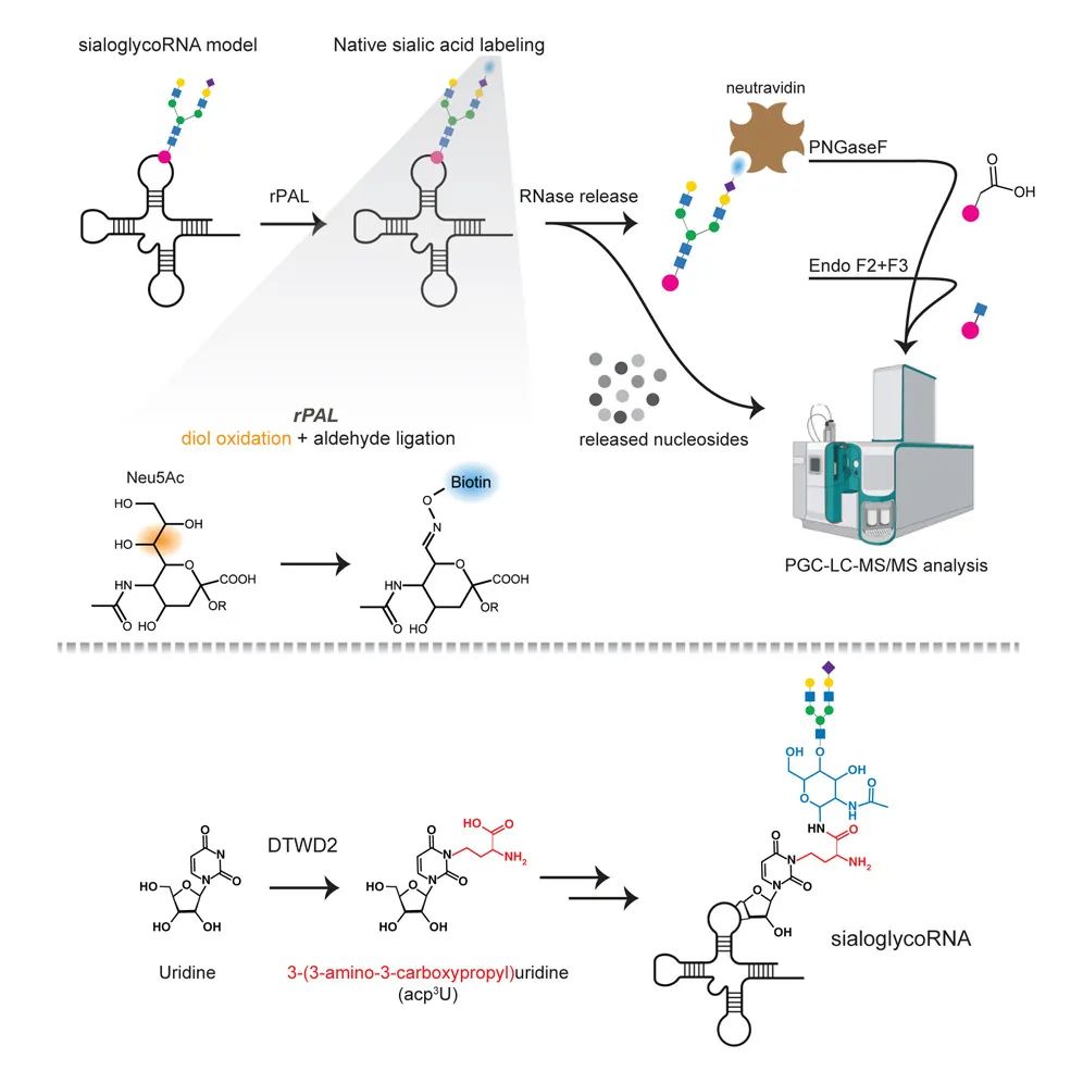 糖基化 (Glycosylation) 是生物分子最普遍、最重要的修饰之一,这些修饰在细胞识别、信号传导、蛋白质折叠和稳定性以及免疫反应等生物过程中发挥关键作用【1】。已知的糖基化生物分子主要包括蛋白质和脂质。在一次偶然的实验中,斯坦福大学诺贝尔化学奖得主Carolyn Bertozzi的博士后Ryan Flynn发现,唾液酸的非天然分子SiaNAz (叠氮化唾液酸) 竟然可以通过细胞自身的代谢途径标记RNA分子。后续通过一系列的研究,题为Small RNAs are modified with N-glycans and displayed on the surface of living cells的论文于2021年在Cell上正式发表,这是科学家们首次意识到糖基化RNA存在的可能【2】。在此之后,关于RNA糖基化的标记、监测及生物功能的研究逐渐在各大期刊上发表。然而,很多科学家对糖RNA分子的存在存疑,其中一个至关重要的信息一直未被解析:RNA如何与N-聚糖连接在一起?这一信息对于验证糖RNA分子的真实存在以及后续研究糖RNA分子的合成途径和生物功能都不可或缺。然而,由于糖RNA分子含量极低(预计在总体RNA分子中的含量低于0.001%),依赖传统手段获取这一关键信息极其困难。