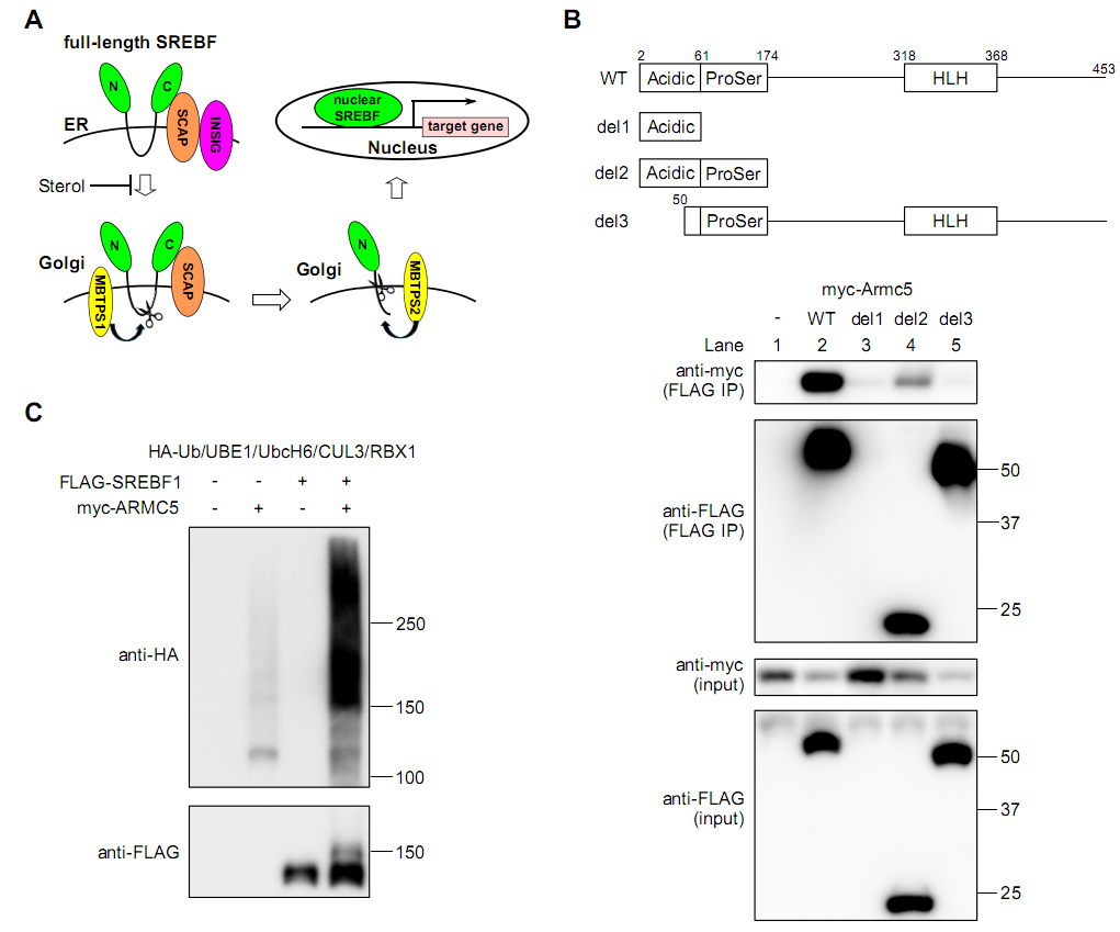 SREBF1分子在脂质代谢过程中发挥着核心作用,已知与SCAP不相关的全长SREBF1能被积极降解,但研究人员并不清楚其背后的分子机制和生物学意义,最近研究人员识别出ARMC5-CUL3复合体或能作为全长SREBF1的E3泛素连接酶,尽管在肾上腺皮质细胞中ARMC5能参与SREBF通路信号,但ARMC5在脂肪细胞中的作用目前并未进一步被研究。