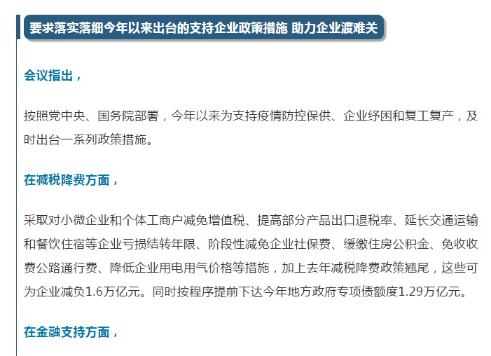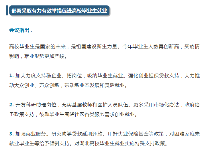 国务院总理李克强4月14日主持召开国务院常务会议确定了四件事,包括要求落实落细今年以来出台的支持企业政策措施,助力企业渡难关;部署采取有力有效举措促进高校毕业生就业;确定加大城镇老旧小区改造力度,推动惠民生扩内需;决定延续西部大开发企业所得税优惠政策。具体内容如下: