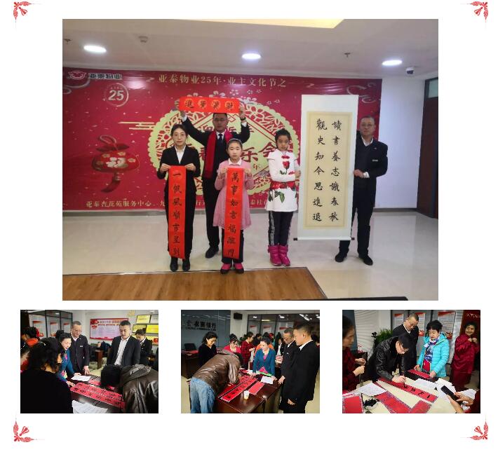 老少同台唱和谐,欢天喜地过新年。新春喜乐会内容丰富,节目表演精美、雅致,体现了亚泰各小区的人文之美,同时亚泰物业邀请协会书画家现场挥毫泼墨,为广大业主朋友书写春联及福字,送上深深的祝福。