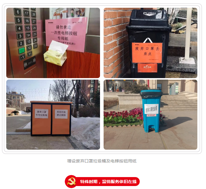 为防止使用过的口罩造成病毒传播,亚泰物业在所有服务小区增设废弃口罩回收专用垃圾桶,张贴显著标识,防止不法分子回收贩卖;时刻关注每一个疫情防控的细节,创新防控措施,为小区电梯增设一次性电梯按钮专用纸,用心守护业主安全,截止2月19日,累计设立废弃口罩垃圾桶50余个;增加一次性电梯按钮用纸2000余个,在新型冠状病毒面前,与广大业主一起共同防御,共保平安。