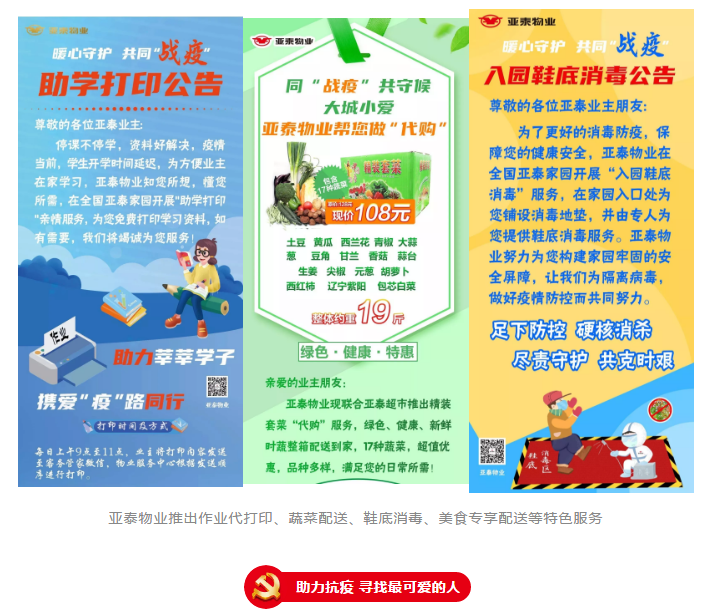 疫情当前,全国数万名医护工作者及军人奔赴疫情前线,亚泰物业党支部传承大爱,助力抗疫,面向所有驰援疫区的亚泰业主推出“寻找最可爱的人”活动,对支援湖北的医护人员、军人、高速路段执勤公安干警补贴物业费专享政策,向特殊时期奋战在疫情一线的逆行人员致敬,与最美逆行者携手共战疫霾。