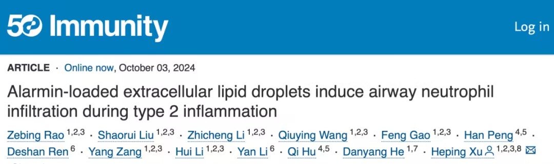 2024年10月3日,西湖大学徐和平课题组在 Immunity 期刊发表了题为:Alarmin-loaded extracellular lipid droplets induce airway neutrophil infiltration during type 2 inflammation 的研究论文。